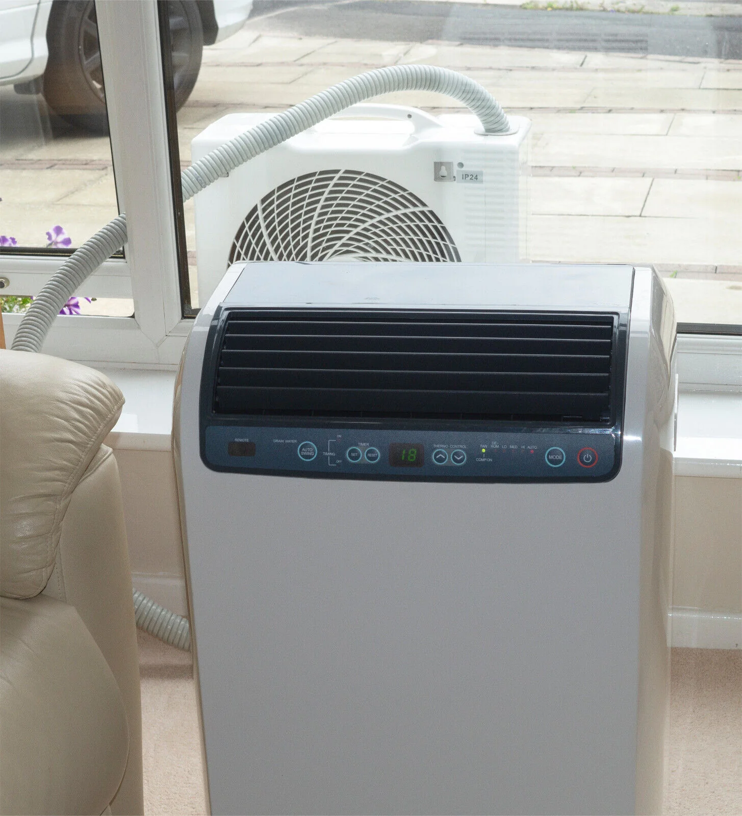 The 15000 BTU per Hour Inverter Split Remote Control Portable Air Conditioner is a large capacity split mobile air conditioner with a fully portable, indoor evaporator on castors. The Portable Air Conditioner has a 2.5 m hose, an easy-to-use push button control panel on the indoor unit with 24 hour timer and a feature-packed remote control for total convenience. The inverter design can save between 30 and 50% of the energy used by conventional air conditioning units.